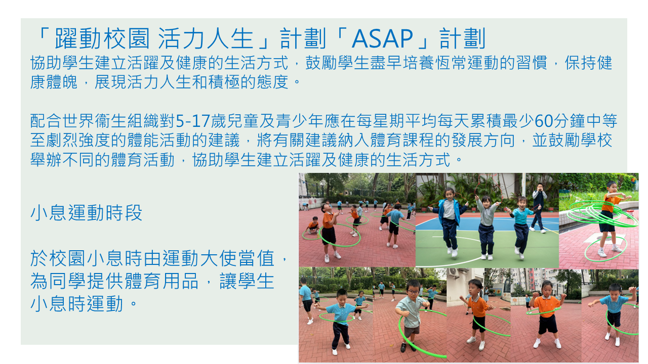 本校一向重視學校成員的身心健康發展,無論在課程、活動方面都力求把健康元素包括在內,近年更著力推行關愛校園文化,透過各種不同的活動,教導學生愛己愛家愛校園外,還要關愛社區與國家,更要熱愛自己生活的環境。