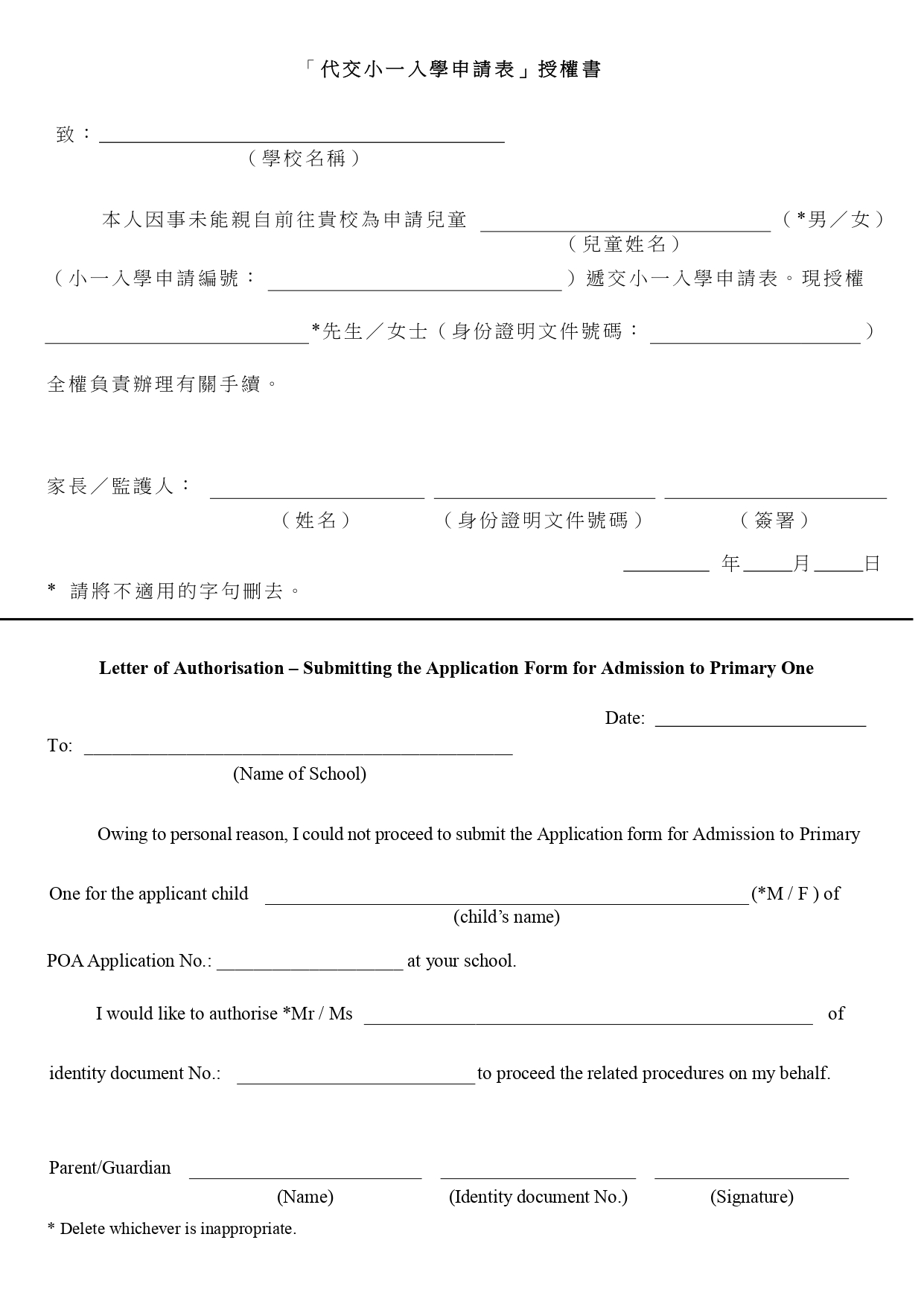 下載附件1 (代交「小一入學申請表」授權書)