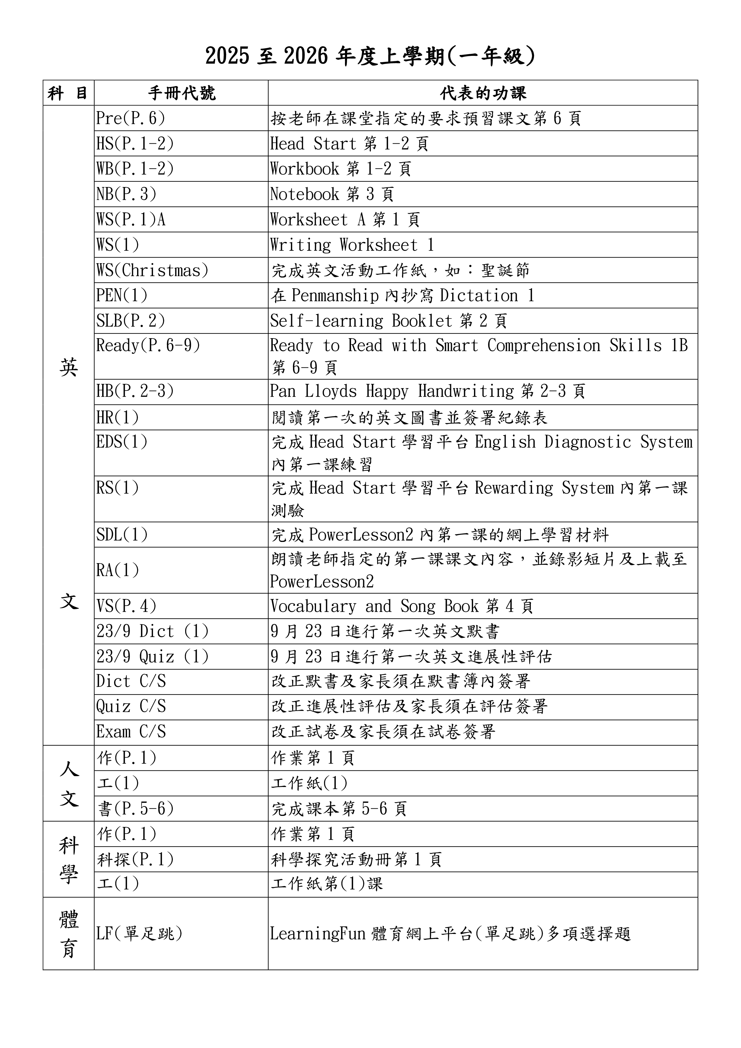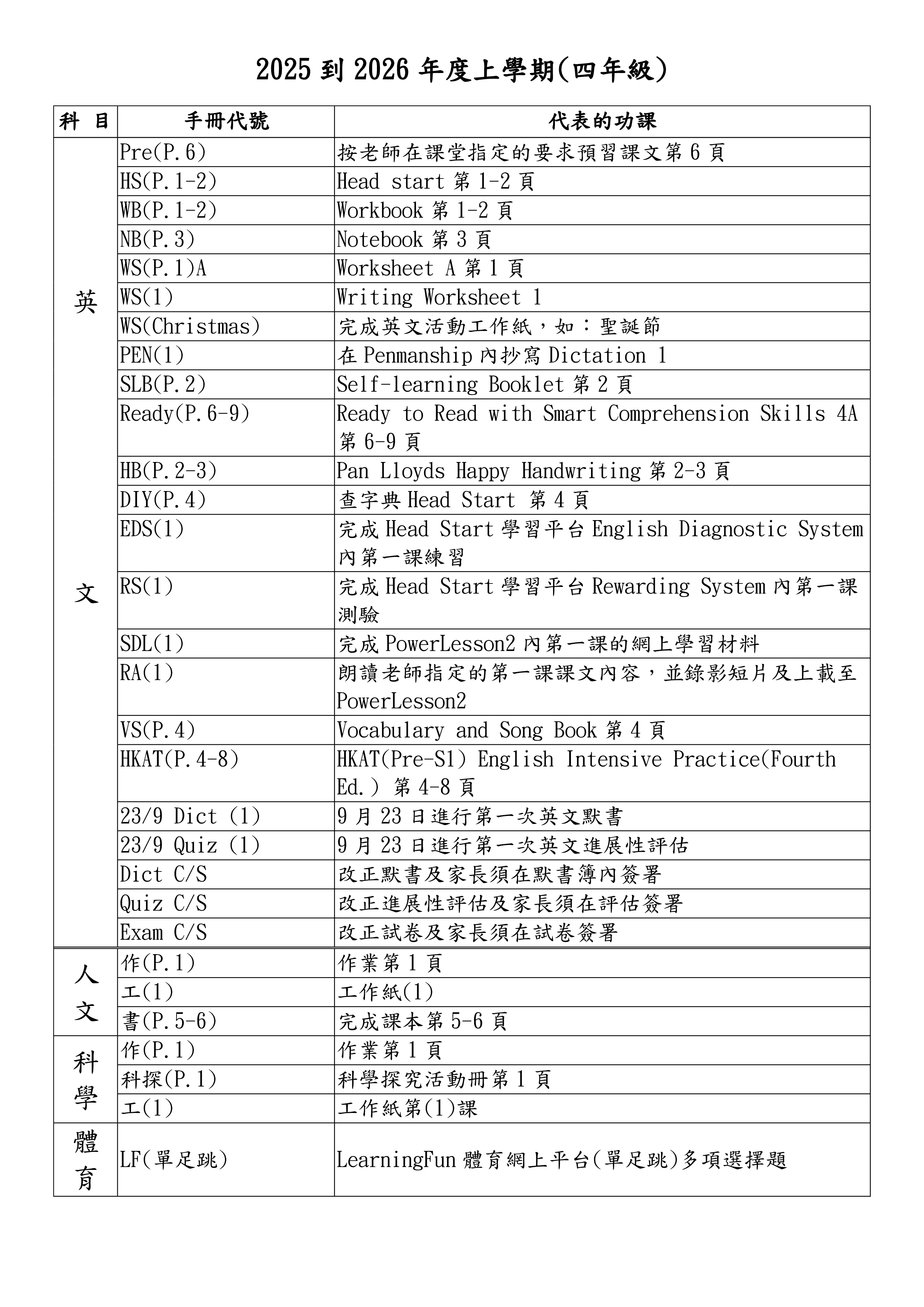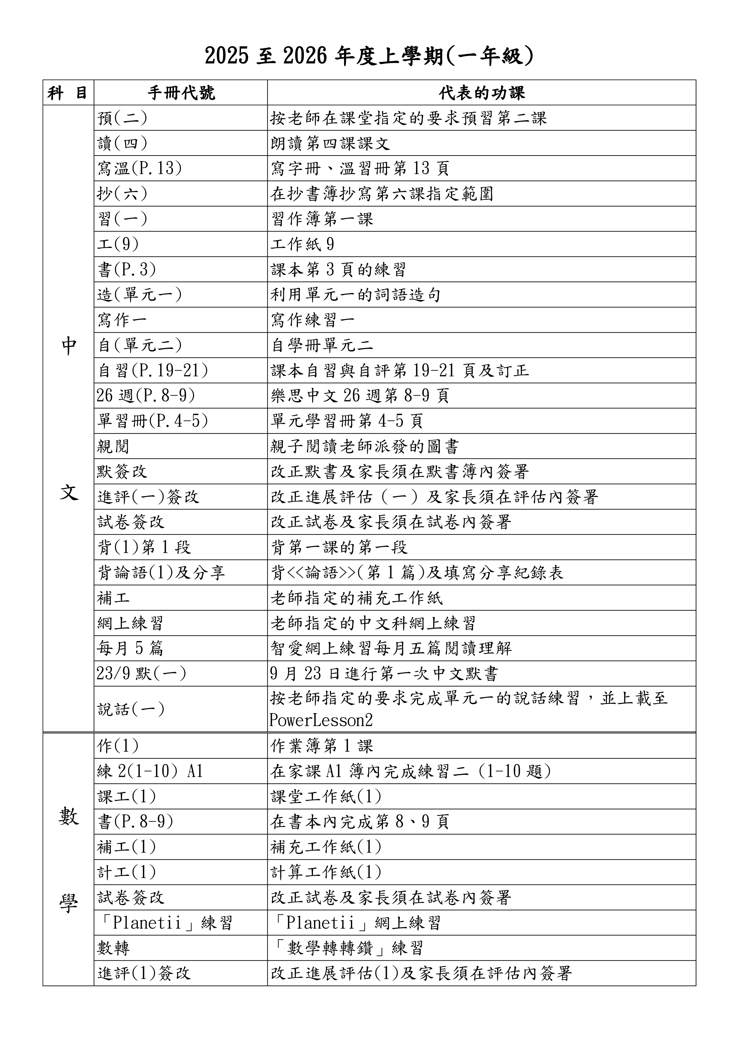 家課代號表