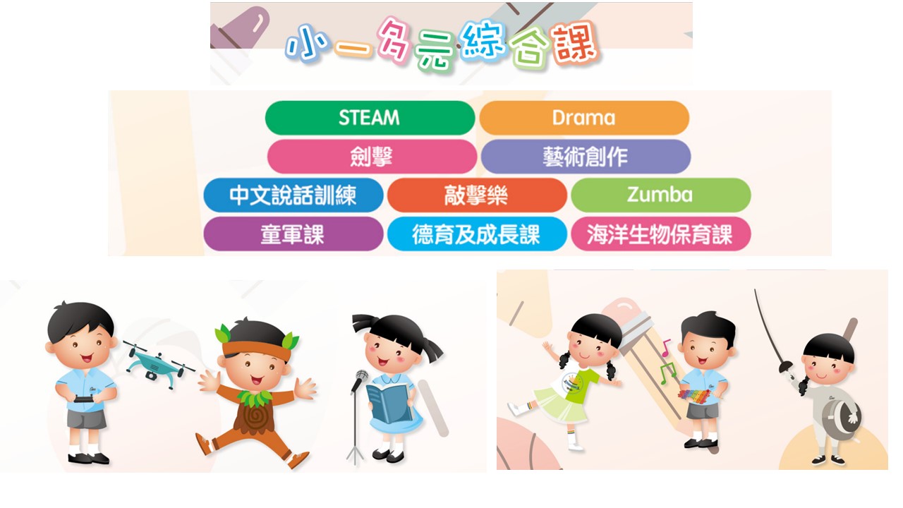 此外,本校為小一學生特別設計小一多元綜合課,上午以學科為主,下午則進行多元化學習活動,包括英語話劇、中文說話訓練、STEAM、Zumba、敲擊樂、海洋生物課及劍擊等,有關活動深受家長和學生歡迎。