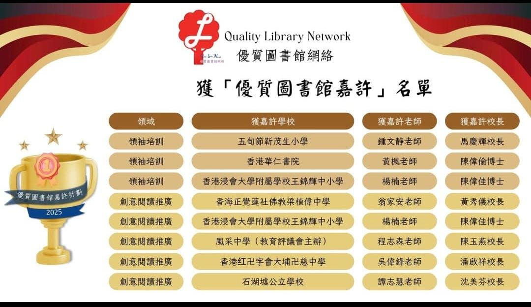 活動名稱:優質圖書館嘉許計劃2025 主辦機構:優質圖書館網絡 獎項名稱:優質圖書館嘉許獎(創意閱讀推廣領域) 獲獎名單:本校