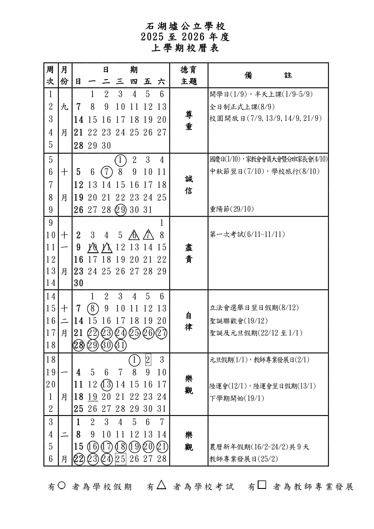 2025至2026年度上學期校曆表